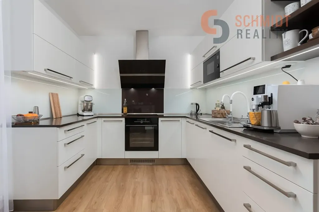 Po vstupu do předsíně s věšákem a odkládacím prostorem vcházíme do prostorné chodby v přízemí. Zde najdeme vestavěné skříně, samostatné WC a koupelnu se sprchovým koutem. Rovně vstupujeme do obývacího pokoje s prostornou kuchyní se vstupem na terasu. Moderní kuchyně z roku 2019 je velice vkusně a prakticky vyřešena. Její součástí je indukční deska, elektrická trouba, myčka, inteligentní digestoř s funkcí provětrávání domu, vestavěná lednička s mrazákem a dostatek odkládacích prostor. Kuchyni od jídelního koutu odděluje zabudovaný barový pult s pracovní deskou a poličkou. Z obývacího pokoje se vstupuje do pracovny / hostinského pokoje, která je orientovaná do ulice.