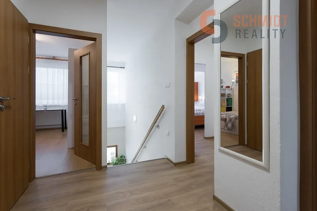 Z chodby se po novém dubovém schodišti dostaneme do patra, kde se nachází ložnice, šatna, dětský pokoj orientované do ulice a další 2 pokoje orientované do zahrady. Ani zde nechybí krásná koupelna s rohovou vanou a samostatným WC. Všechny pokoje mají k dispozici balkony.