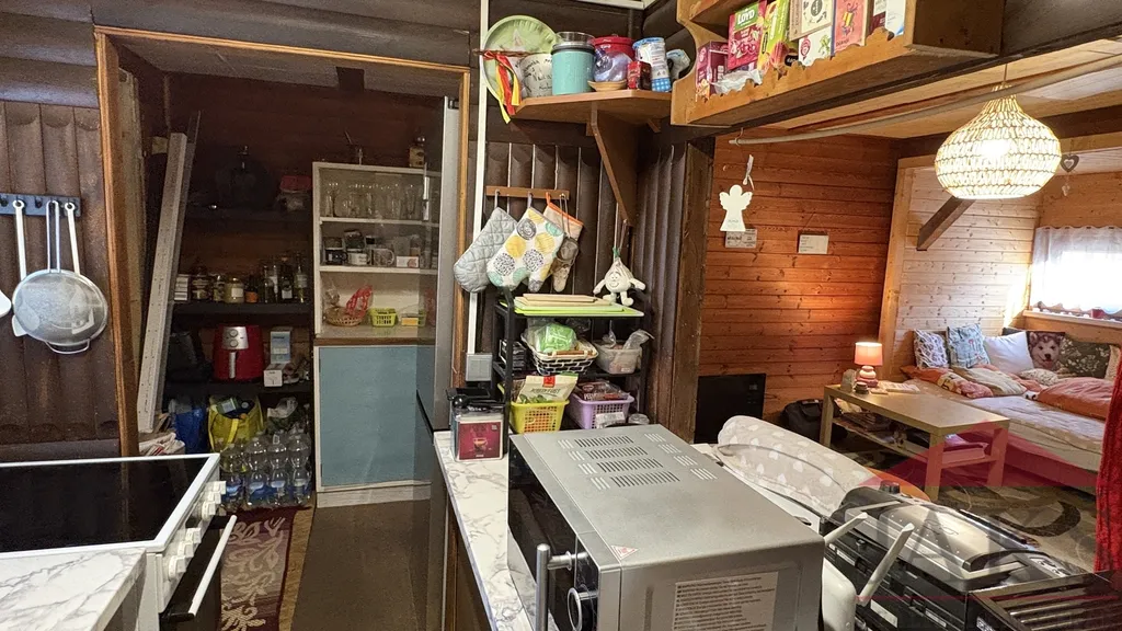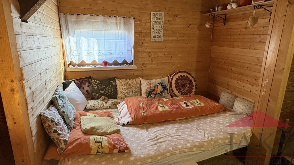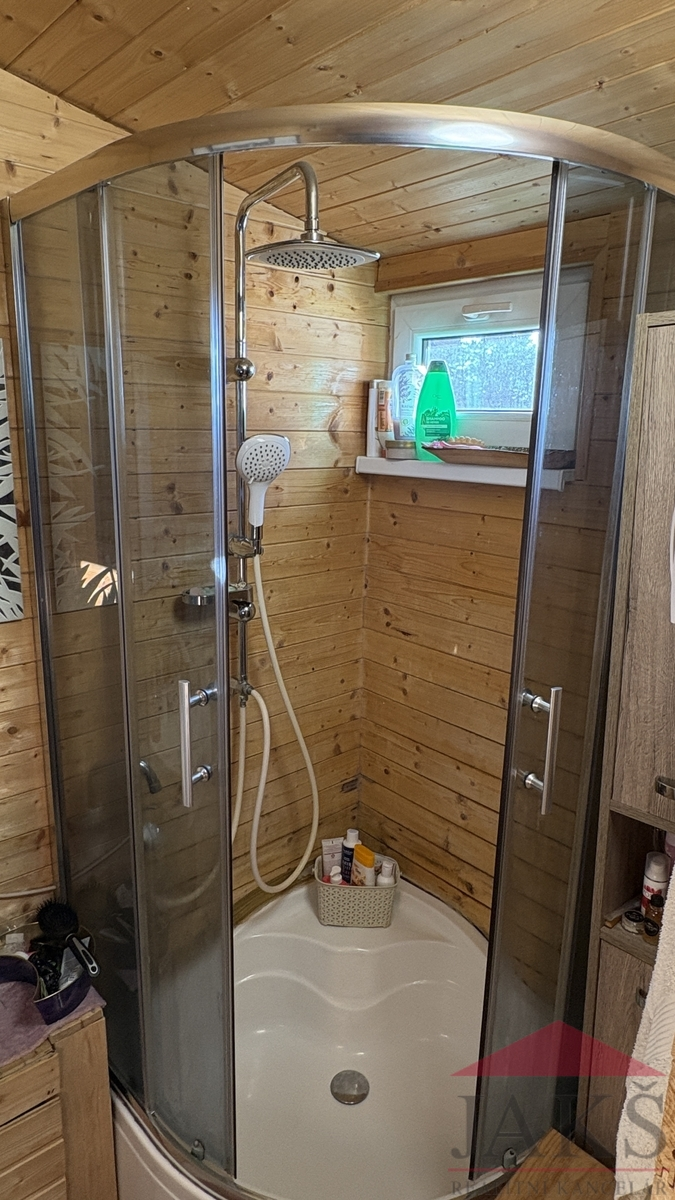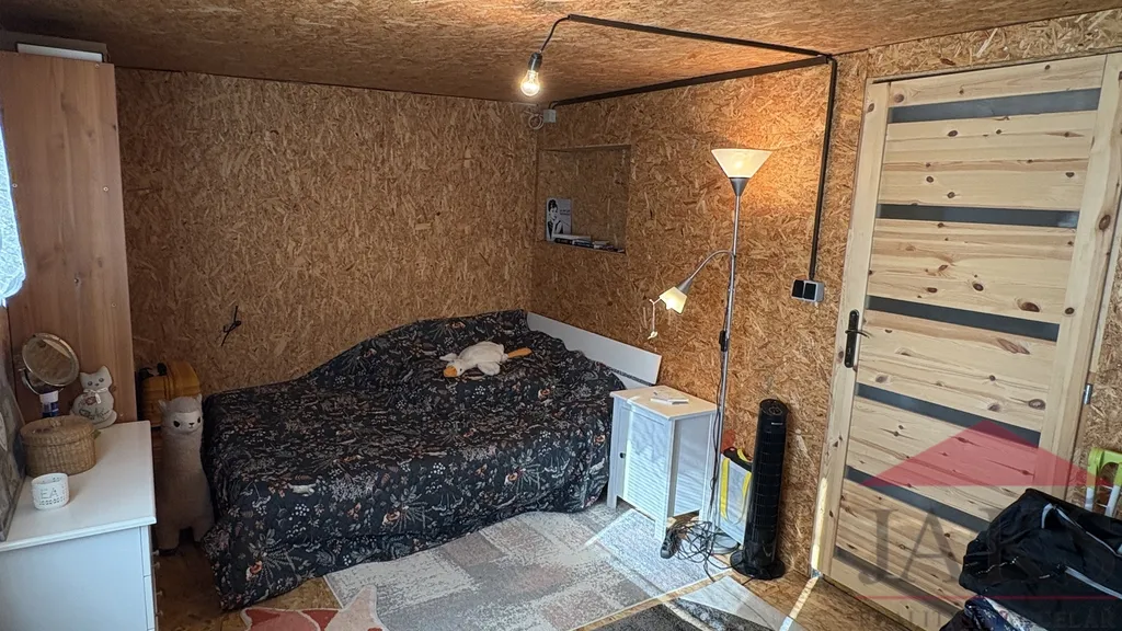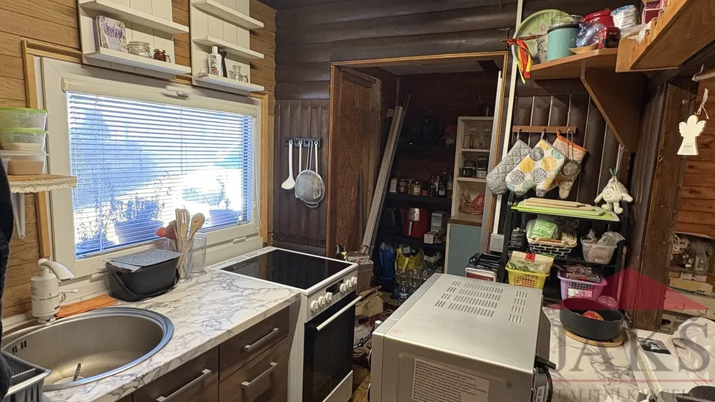 Popis: chodba (pračka a sušička), koupelna (umyvadlo se zrcadlem, sprchový kout, oddělené WC) s oknem, kuchyňský kout (kuch. linka s dřezem, HV troubou se sklo-ker. deskou, MV troubou a lednicí s mrazákem), obývací pokoj (kamna) se spacím koutem a ložnice.