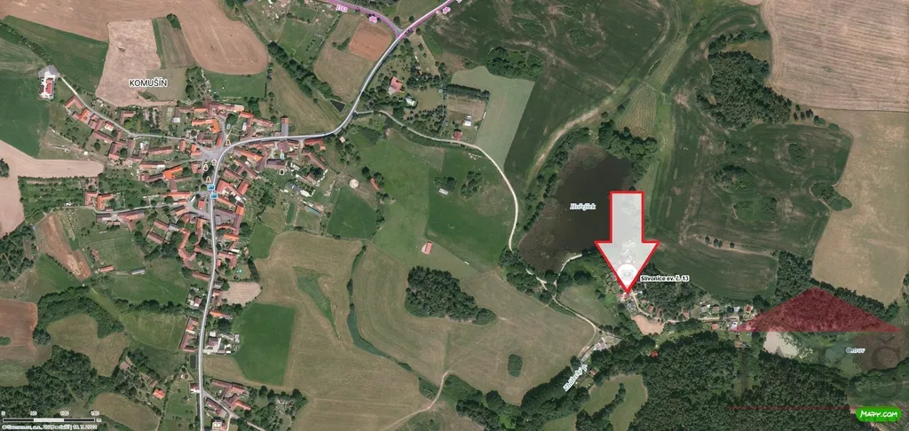 Přístup po udržované obecní šotolinové obecní cestě okolo rybníku.