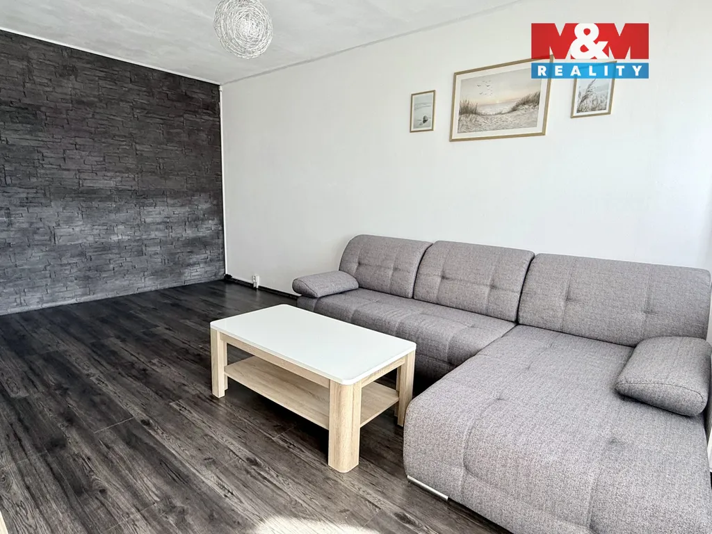 Dispozice a vybavení: obývací pokoj se sedací soupravou a obývací stěnou, vstup na zasklenou lodžii