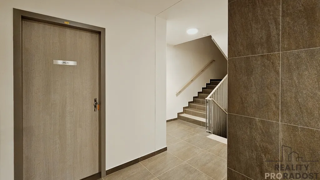 Dispozice bytu tvoří vstupní chodba vybavená šatní skříní, botníkem a věšákovou stěnou, koupelna se sprchovým koutem, samostatné WC a obývací pokoj s novou kuchyňskou linkou. Kuchyň je vybavena varnou deskou, elektrickou troubou, mikrovlnnou troubou, myčkou, lednicí a dřezem. Byt je proveden z kvalitních moderních materiálů a nabízí komfort nového bydlení.