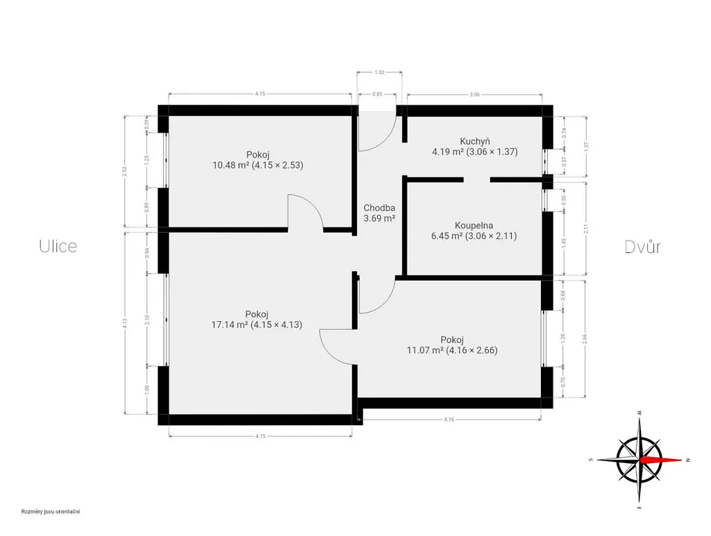 Byt nyní disponuje třemi pokoji. Největším z nich je obývací pokoj o velikosti 17 m². A společně s druhým menším pokojem o velikosti zhruba 10 m² jsou orientované do jednosměrné ulice na jižní světovou stranu. V těchto pokojích jsou původní parkety. V celém bytě jsou plastová okna s dvojskly. Na protější straně bytu naleznete ložnici s orientaci do severního vnitrobloku, zde je podlaha betonová.