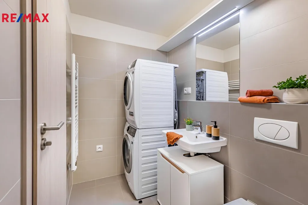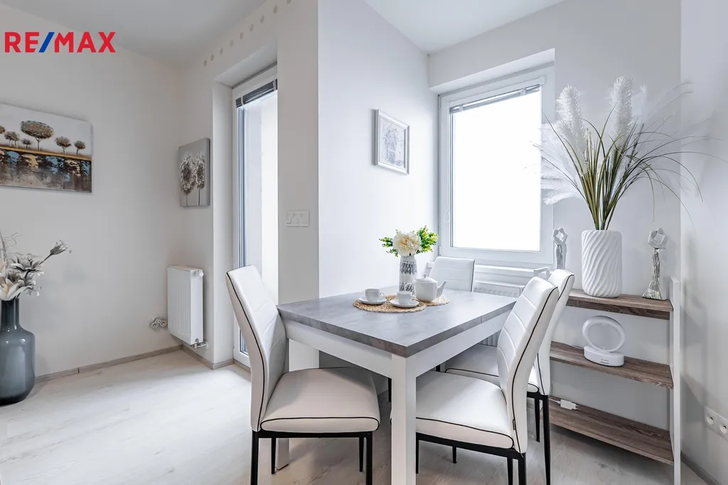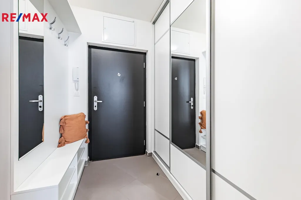 Interiér je připraven k okamžitému nastěhování bez dalších investic. V obývací části je pohodlný gauč, televizor (2 ks) a jídelní stůl. Ložnicová zóna nabízí manželskou postel a praktické úložné prvky. Kuchyňská linka s kvalitními spotřebiči AEG (trouba, varná deska, digestoř, myčka, lednice) je doplněna o kávovar, topinkovač a mixér značky MICAN. Koupelna je vybavena sprchovým koutem a pračkou se sušičkou. V předsíni potěší velká vestavěná skříň a botník, v bytě je dále menší komora a příjemná lodžie pro ranní kávu či večerní posezení.