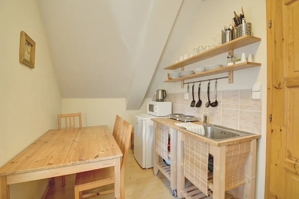 Majitelé mají k dispozici 2 samostatné apartmány (2lůžkový a 5lůžkový) a soukromou společenskou místnost v přízemí. Tato část zahrnuje kuchyni, jídelní stoly, barový pult s posezením a krb, což vytváří příjemné zázemí pro rodinu nebo provozovatele objektu. Prostor je oddělen od části určené hostům.
