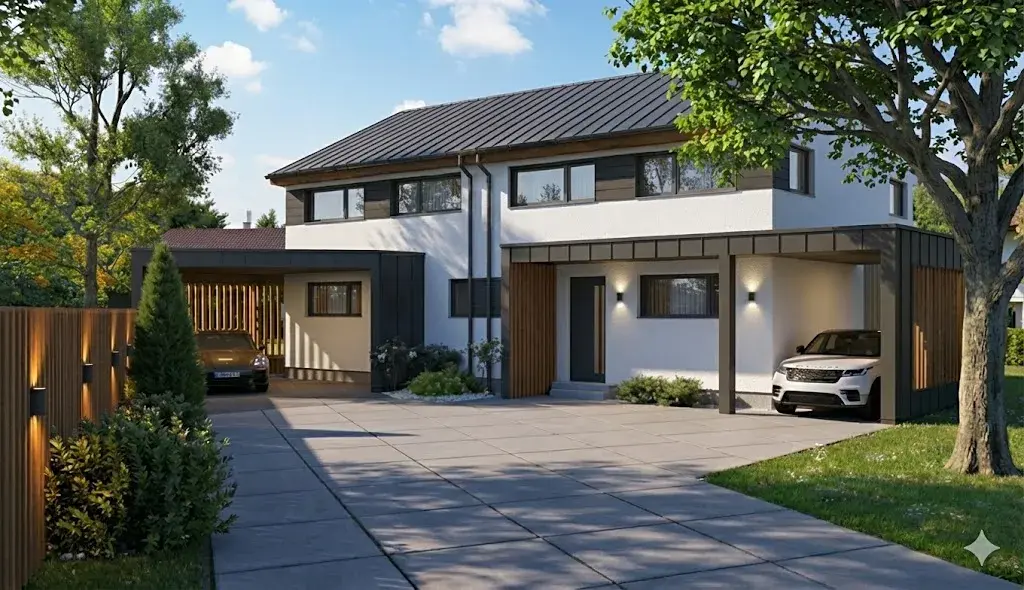 Parkování: Projekt zahrnuje vlastní carport (kryté stání) a na příjezdové cestě vzniknou 3 další parkovací stání pro návštěvy/v podílu.