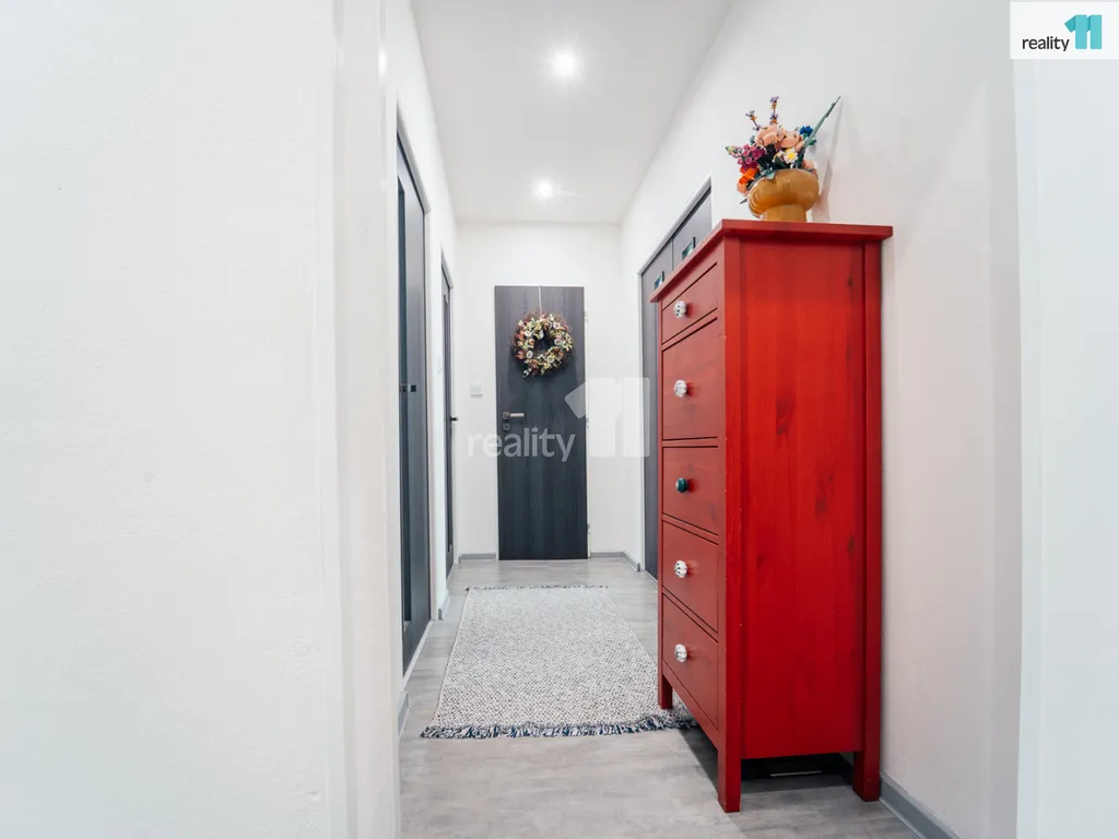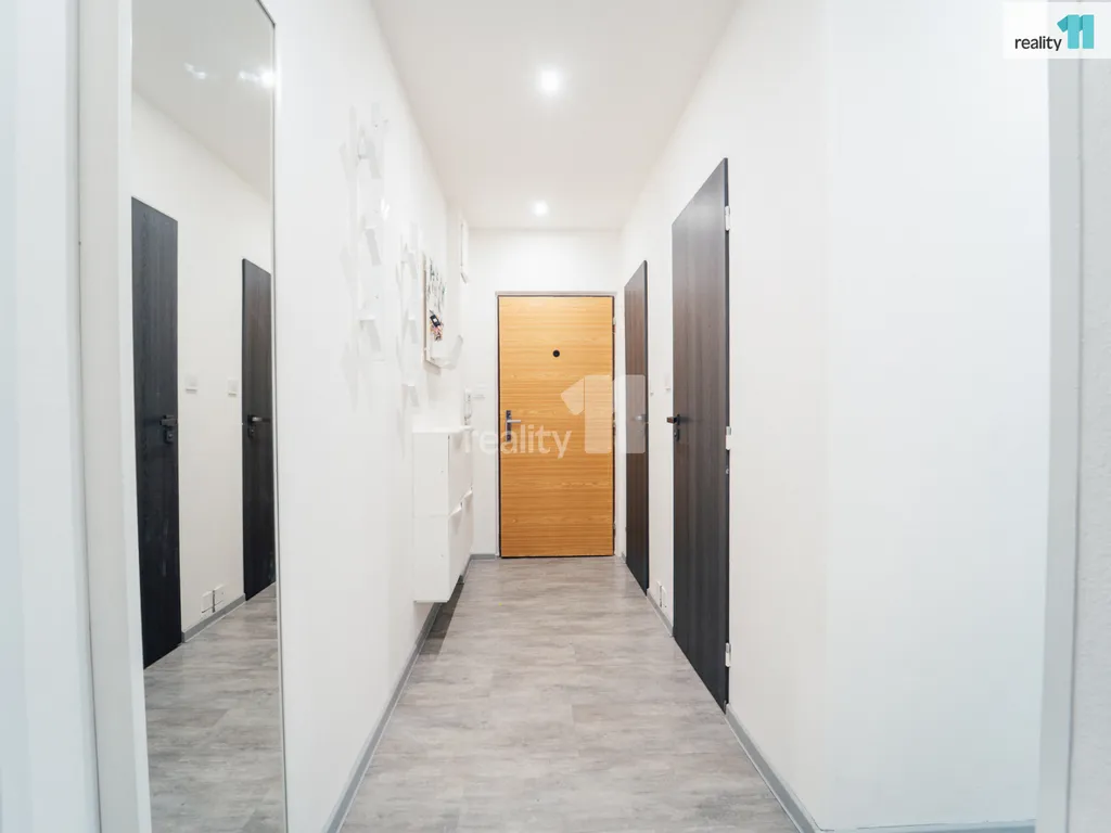 Celý byt prošel nákladnou a zdařilou rekonstrukcí - nové podlahy, omítky, elektroinstalace, zděné jádro, plastová okna s vnitřními roletami Den a Noc, koupelna s vanou, samostatné WC, plně vybavená rohová kuchyně s vestav. spotřebiči a jídelním koutem, praktická středová chodba s komorou, oddělující dva menší pokoje - ložnici (8,9 m²), dětský pokoj (12,1 m²) od prostorného obývacího pokoje (16,3 m²) s velkou lodžií (6,0 m²) orientovanou na jih. Příslušenstvím bytu je velká sklepní kóje (2,9 m²).