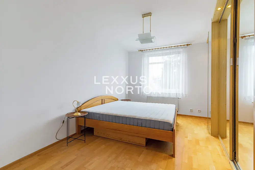 Obývací pokoj s kuchyňským koutem tvoří srdce bytu – je světlý, prostorný a má vstup na terasu a zahradu, která je o několik schodů níže než byt samotný. Na zahradě je pergola, sprchový kout a případně dostatek místa i pro umístění vířivky.