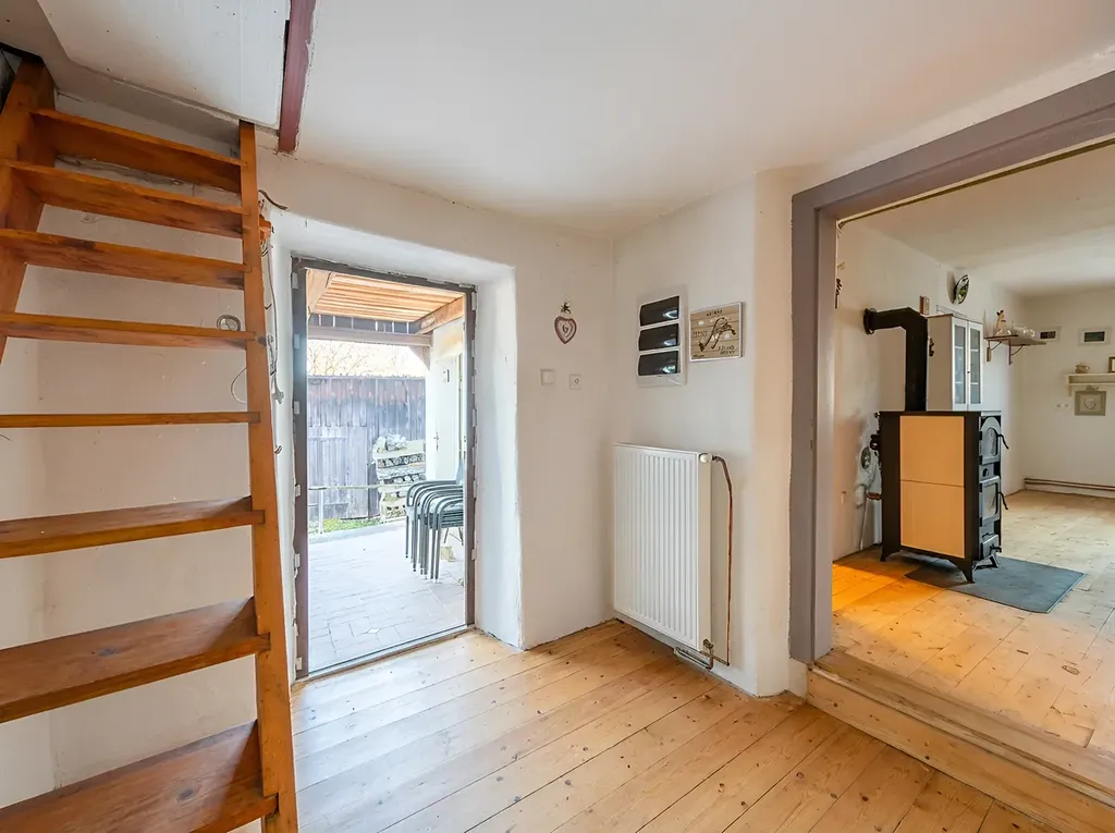 Zadní třetina domu v přízemí je ponechána před rekonstrukcí, což dává novému majiteli jedinečnou možnost přizpůsobit si dispozici přesně na míru svým potřebám.