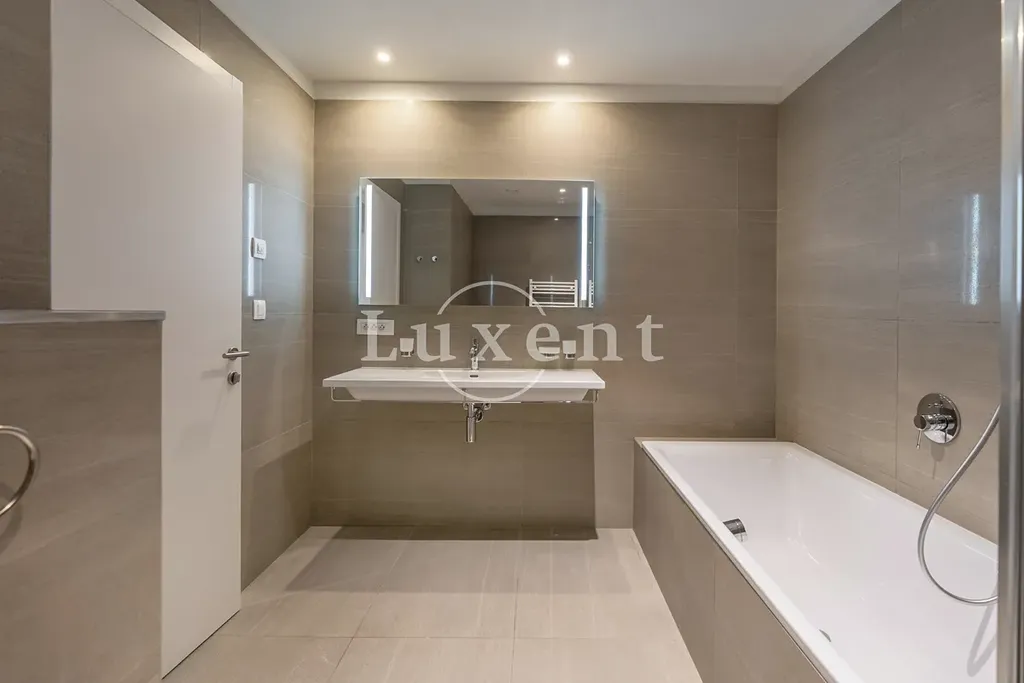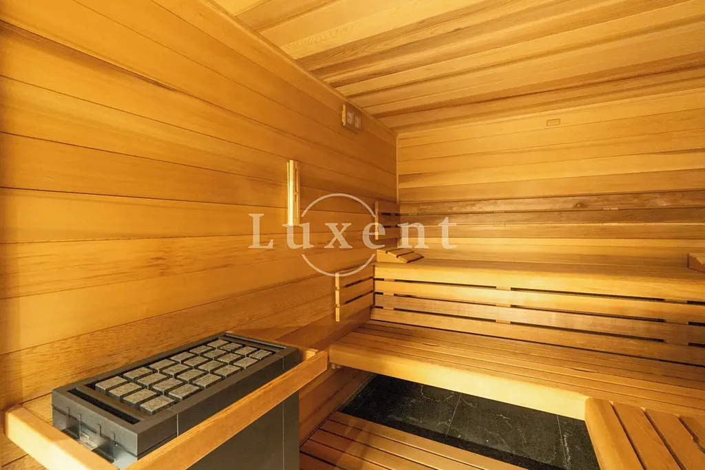 Dispozice zahrnují prostornou a světlou obývací místnost, moderní kuchyňský kout nadstandardně vybavený všemi spotřebiči, tři ložnice, jednu s vlastní koupelnou, druhou koupelnu s vanou, sprchovým koutem, toaletou a bidetem, předsíň, oddělenou technickou místnost s pračkou a sušičkou a samostatnou toaletu pro hosty.