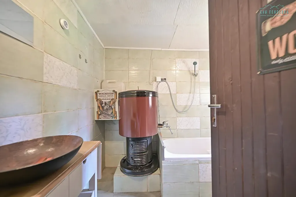 Chata je vytápěna krbovými kamny s výměníkem napojeným na radiátory i v podkroví.
