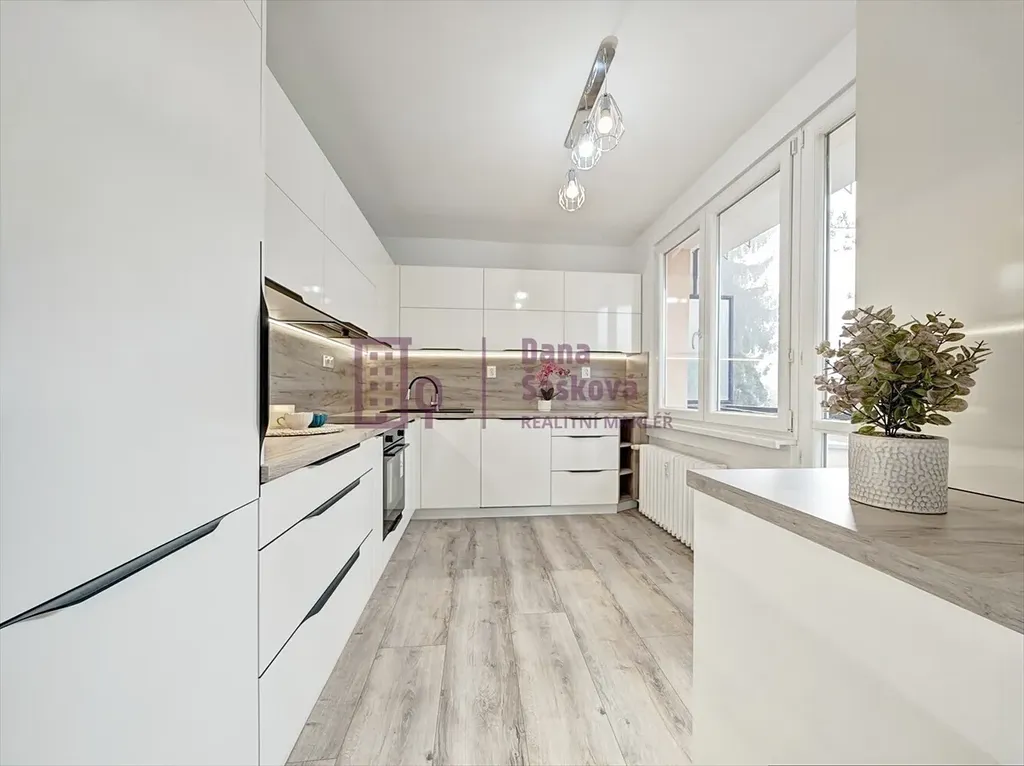 Součástí vybavení je nová kuchyňská linka s vestavěnou myčkou nádobí, digestoří, sklokeramickou deskou, elektrickou i mikrovlnnou troubou a kombinovanou chladničkou s mrazákem.