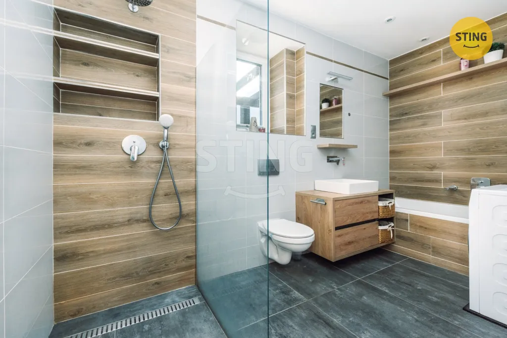 Koupelna je vybavena vanou, sprchovým koutem, umyvadlovou skříňkou a toaletou. Použity jsou pod omítkové baterie značky Grohe. Do patra vede schodiště s masivními dubovými schodnicemi. V horním podlaží se nachází ložnice se šatnou a 2 dětské pokoje. K dispozici jsou také půdní úložné prostory.