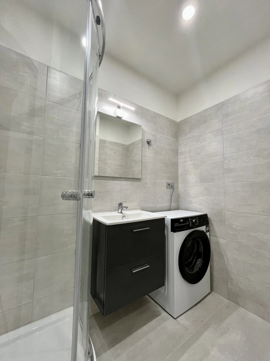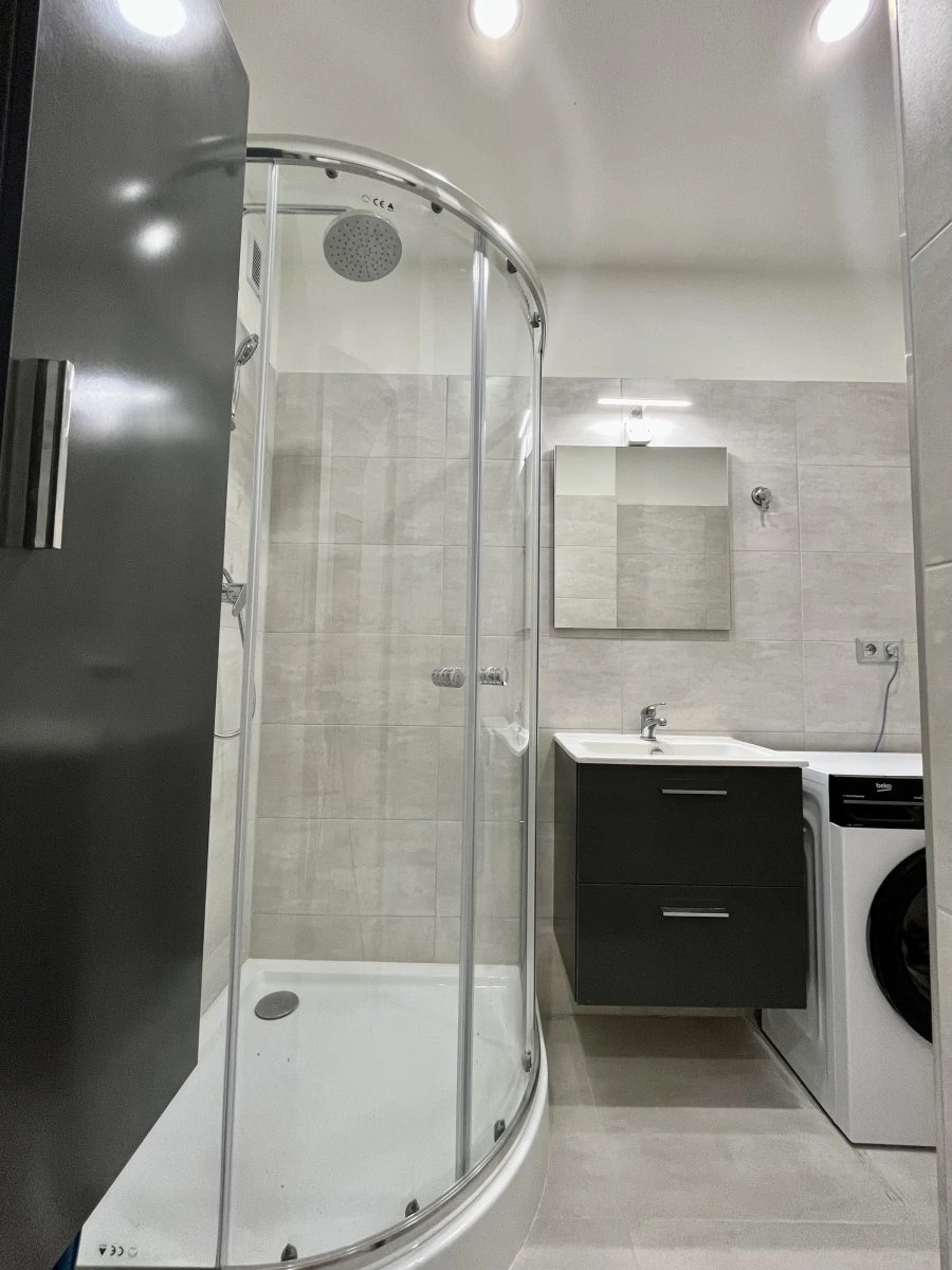 Byt nabízí prostornou chodbu s šatní skříní a botníkem ze které vstupujeme do koupelny, která nabízí sprchový kout, umyvadlo, skříňku, pračku a sušičku.