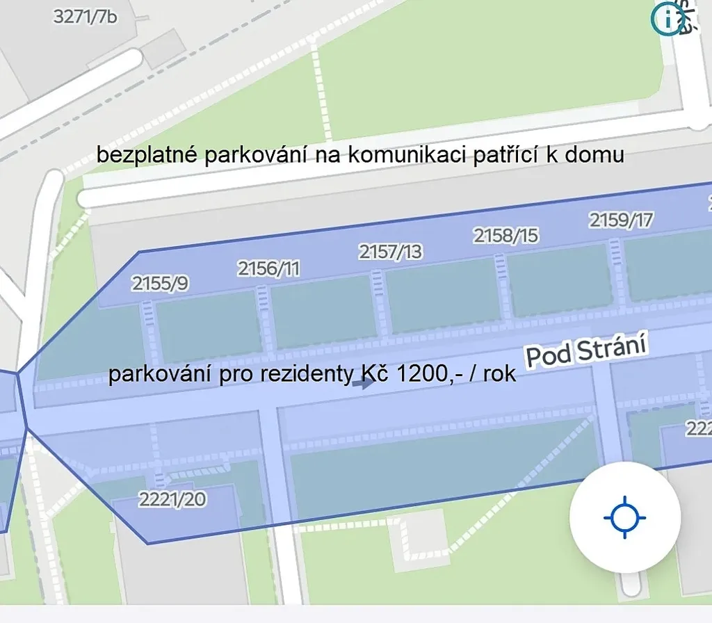 bezplatné parkování u zadní strany domu na komunikaci, patřící k nemovitosti, popř. placené rezidenční parkování za 1200Kč za rok