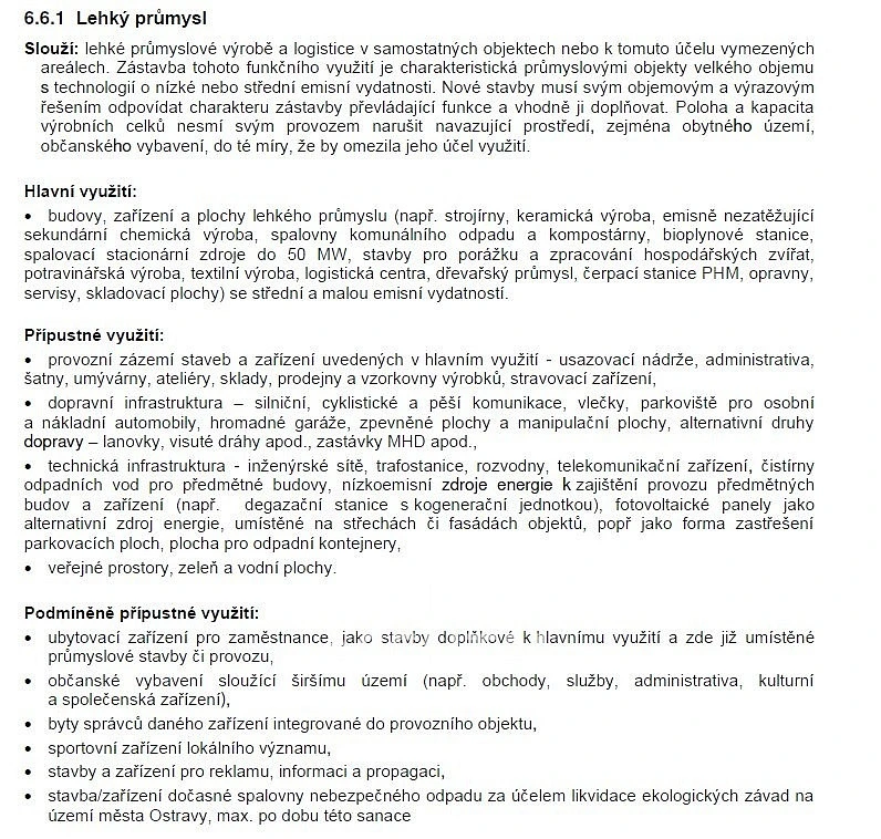 - budovy, zařízení a plochy lehkého průmyslu se střední a malou emisní vydatností, opravny, servisy, skladovací plochy, čerpací stanice PHM, bioplynové stanice, prodejny a vzorkovny výrobků, ateliéry, sklady, hromadné garáže, parkovací plochy, zpevněné a manipulační plochy, sportovní zařízení lokálního významu, a další.