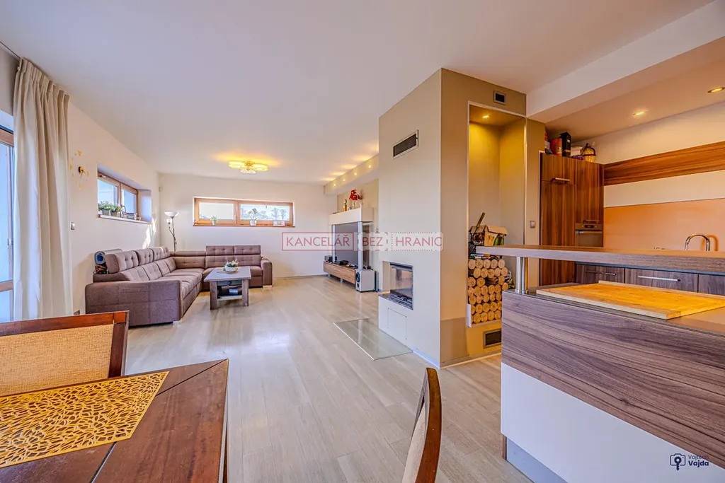 Dominantou domu je světlý obytný prostor s jídelnou, ze které je přímý vstup na terasu a do stylové dřevěné pergoly s posezením, ideální pro relaxaci, rodinné večeře i setkání s přáteli.