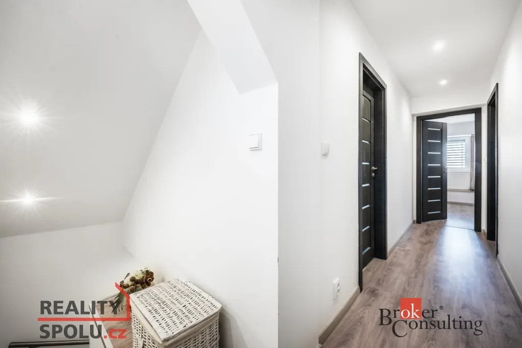 Ve druhém patře se nachází další 3 neprůchozí pokoje, které lze využít jako ložnice, dětské pokoje, pracovnu nebo například šatnu. K dispozici je zde i druhá koupelna, tentokrát se sprchovým koutem a toaletou, což zajišťuje větší komfort pro vícečlennou rodinu.