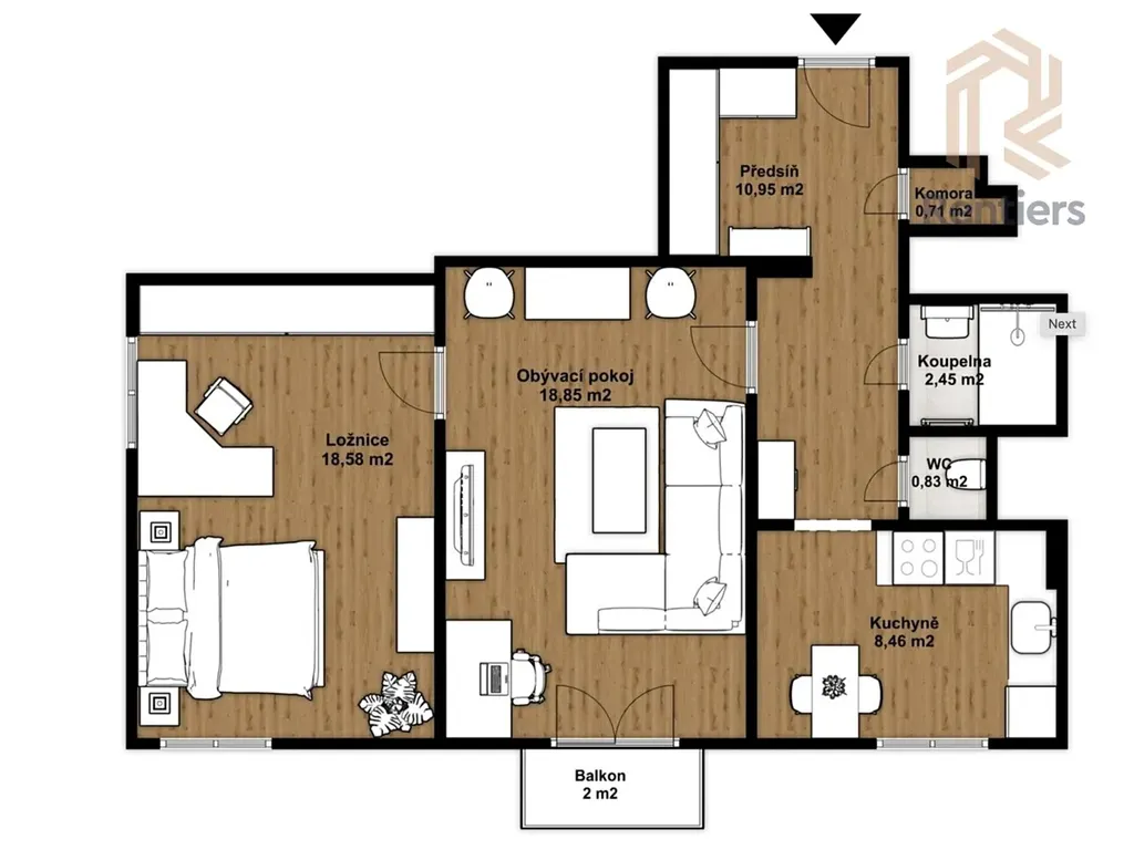 Nabídka dlouhodobého pronájmu bytu 2+1/B + ve 2. patře cihlového domu bez výtahu. Byt o výměře 61m2 (+balkón 2m2 a sklep 6m2) je po kompletní rekonstrukci a bude se pronajímat kompletně zařízený. Vybavení: pračka, TV, závěsy, postel (bez matrace), kuchyňský stůl a židle, botník, vestavěné skříně, kuchyňská linka se spotřebiči (sporák, trouba, myčka,). Dispozice: Obývací pokoj (18,85 m²) se vstupem na balkon, ložnice (18,58 m²), kuchyň (8,46 m²), koupelna, oddělené WC, komora a prostorná chodba. Náklady (pro 2 osoby): Služby (teplo, voda, odpad, atd.) 4500,-Kč/měs., elektřina 1000,- Kč/měs., plyn 300 Kč/měs.