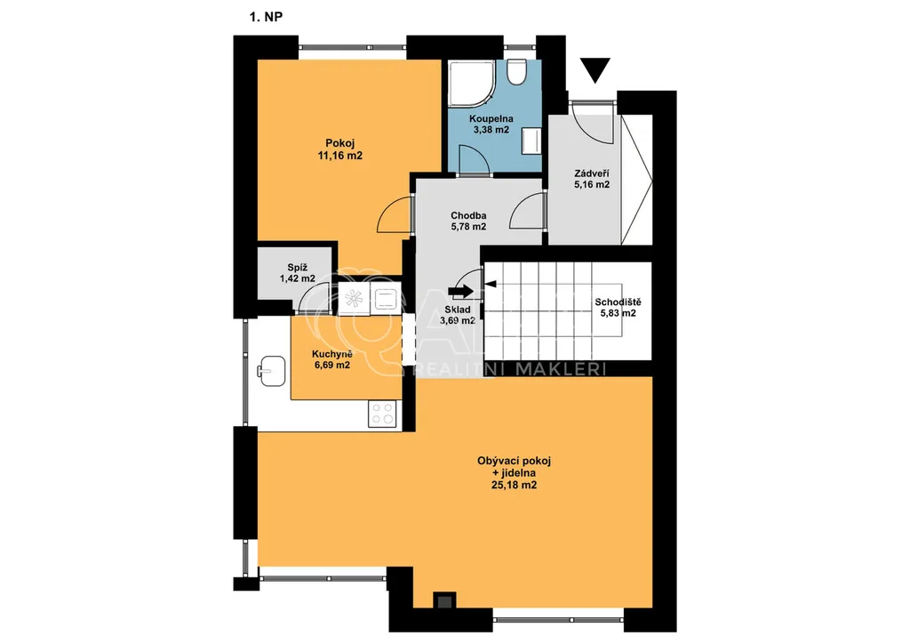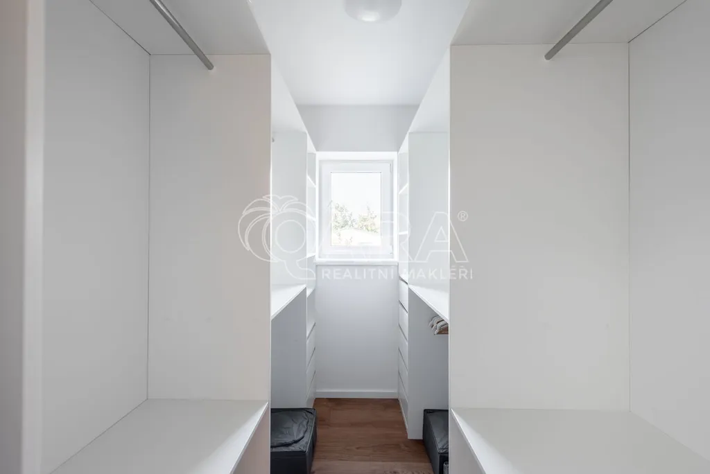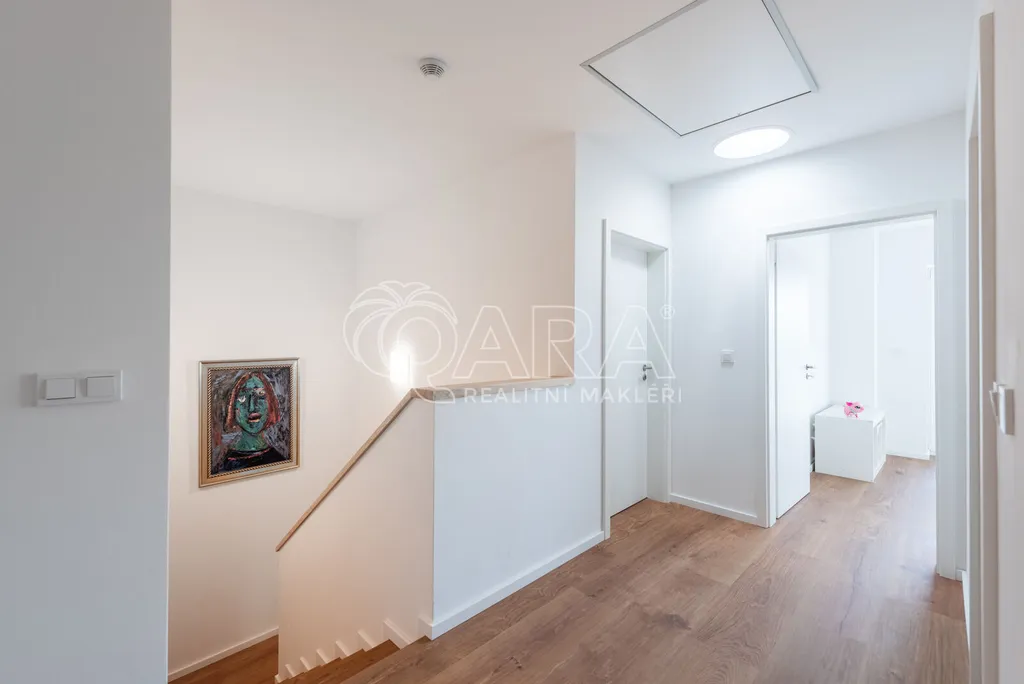 Dům má velmi praktickou dispozici s dostatkem úložných prostor. V přízemí domu se nachází vstupní chodba s vestavěnou skříní, prostorný, jižně orientovaný obývací pokoj s jídelnou se vstupem na vydlážděnou terasu, dále kuchyň a spíž, pokoj o výměře 11 m² (může sloužit jako pracovna nebo pokoj pro hosty) a dále koupelna se sprchovým koutem a toaletou. Kuchyň byla dělaná na míru od společnosti Sykora. Samozřejmostí jsou kvalitní vestavěné spotřebiče značky Electrolux - indukční varná deska, myčka, elektrická trouba, lednice s mrazákem a digestoř značky Elica. Dalším úložným prostorem v přízemí je komora pod schodištěm. V patře se pak nacházejí tři prostorné pokoje, každý o výměře 13 m², šatna s úložným prostorem dělaným na míru, technická místnost s přípojkami na pračku a sušičku s další toaletou, a větší koupelna s dvojumyvadlem, vanou a sprchovým koutem. Výklopným schodištěm je přístupný pochozí půdní prostor vhodný pro ukládání sezónních věci.
