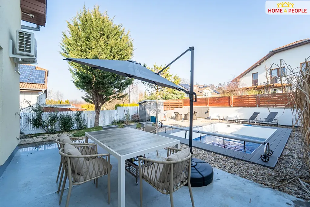 Zahrada o velikosti 300 m² nabízí soukromí i místo pro relaxaci u bazénu (5x3 m od firmy Albixon z roku 2024) a venkovní posezení na terase (20 m²). Parkování před domem pro 3 auta.