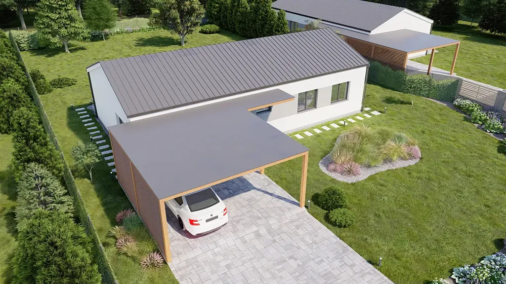3️⃣ Premium - kompletně dokončený dům + přístřešek pro 2 vozy + krytý vstup.
