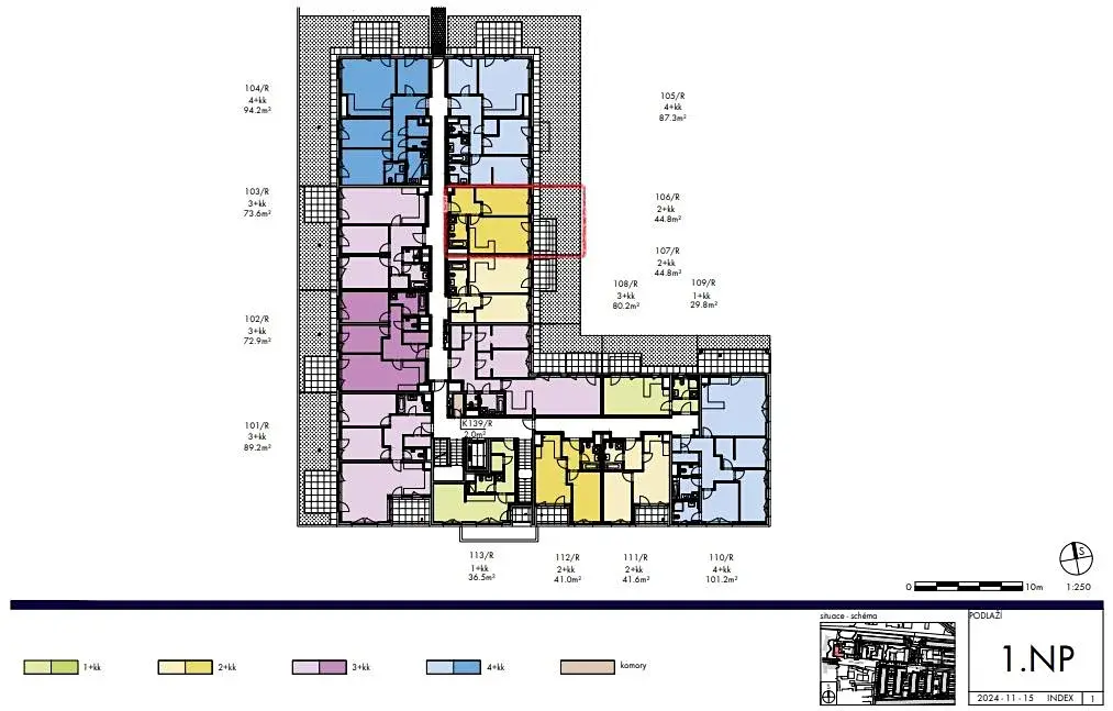 Dispozice: vstupní chodba (5,9 m), obývací pokoj s přípravou na kuchyň (19,6 m), ložnice (12,5 m), koupelna s vanou a WC (5 m). Byt je orientován na východ do klidného vnitrobloku. Celková plocha včetně konstrukcí činí 44,8 m.