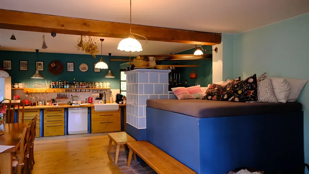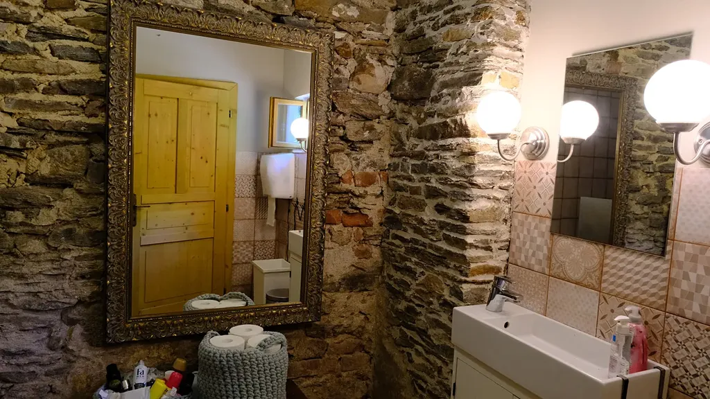 - vstupní chodba, seknice cca 60 m2 (kuchyně, kuchyňský kout + posezení, kachlová kamna s pecí, výměníkem a spaním, špajz, sklep, koupelna (sprchový kout, umyvadlo, WC, dřevěné schody do 1.patra