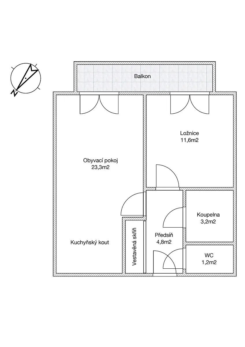 Dispoziční řešení bytu je praktické a funkční. Po vstupu do bytu se nacházíme v předsíni, ze které jsou samostatné vstupy do koupelny a oddělené toalety. Z předsíně je dále vstup do samostatného pokoje a do obývacího pokoje s kuchyňským koutem.