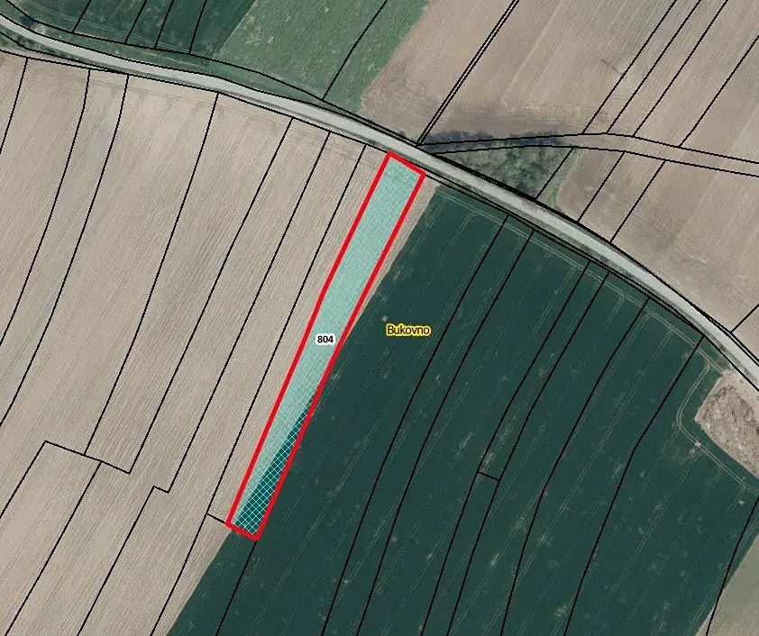 Nabízíme k prodeji 50 % podíl na pozemku p.č. 804 o celkové výměře 5 550 m2 v k.ú. Bukovno, vedené na LV 254. Pozemky leží v blízkosti obce a jsou řádně obhospodařovány místním zemědělcem, který dodržuje osevní postupy. Smlouva je uzavřena na dobu neurčitou s výpovědní lhůtou 1 rok. Pozemky jsou tedy vhodné k vlastnímu hospodaření, popřípadě směnu.