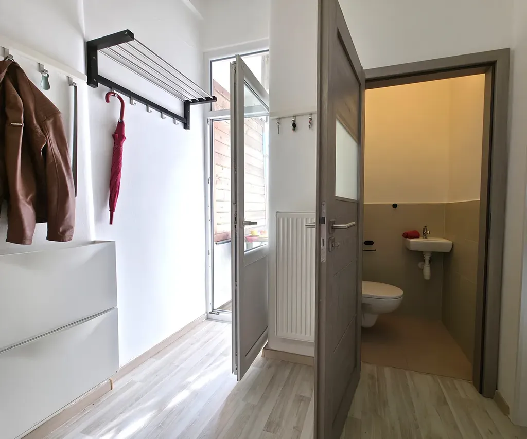 Praktickou součástí bytu je komora, ve které se nachází pračka a policový úložný systém.