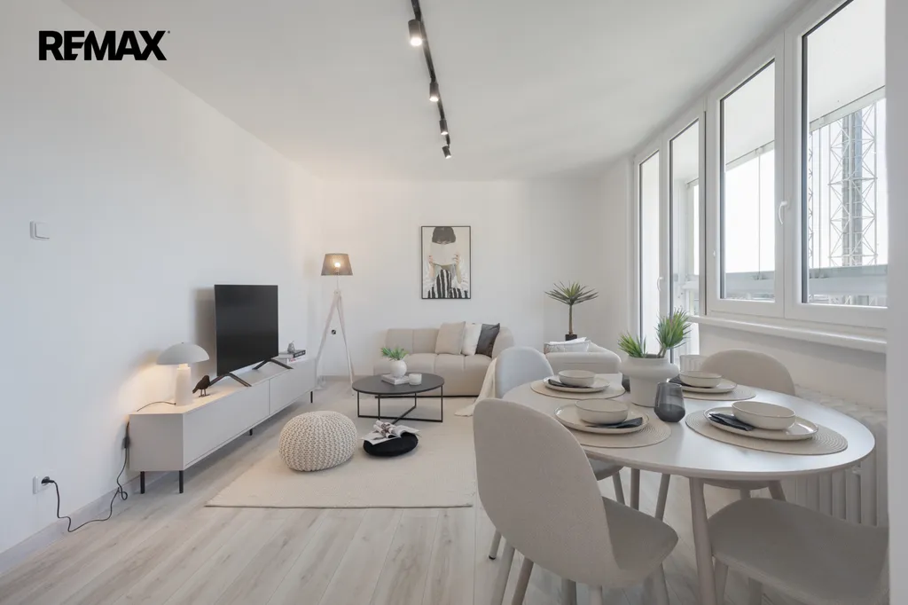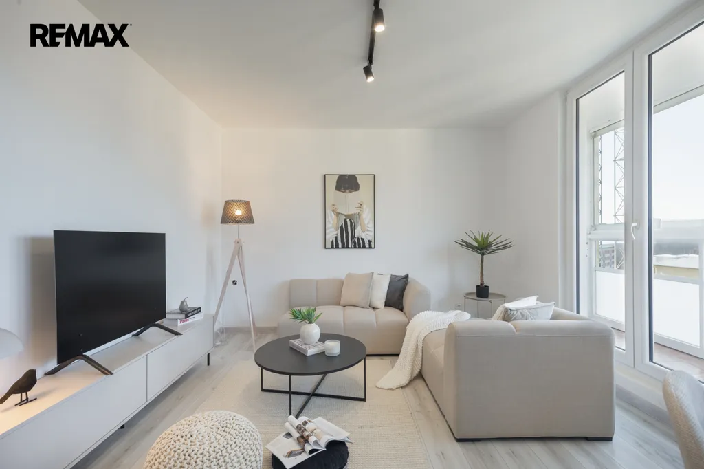 ✅ Slunný obývací pokoj - plně vybavený novým nábytkem: sedačka, TV komoda, knihovna, kulatý stůl se židlemi,/ mimo dekorací/, vstup na velkou podélnou lodžii, orientace na západ