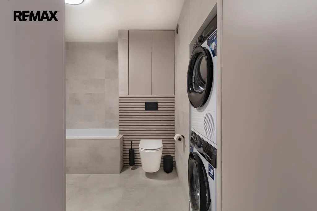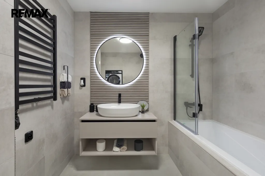 ✅ Koupelna s vanou se zástěnou pro příjemné sprchování, umývadlová skříňka zhotovená na míru, kulaté zrcadlo s LED osvětlením, otopný žebřík antracitový, béžové velkoformátové obklady s dlažbou, závěsné WC, pračka a sušička v komíně, skříňka nad WC