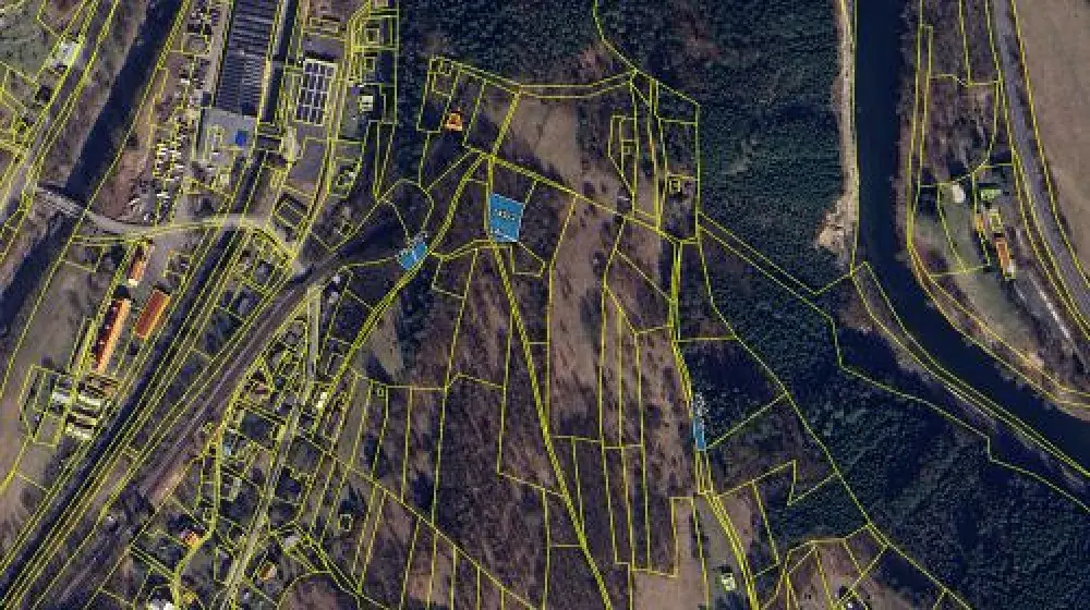 ➡️ Kombinace zeleně, lesního pozemku a komunikace.