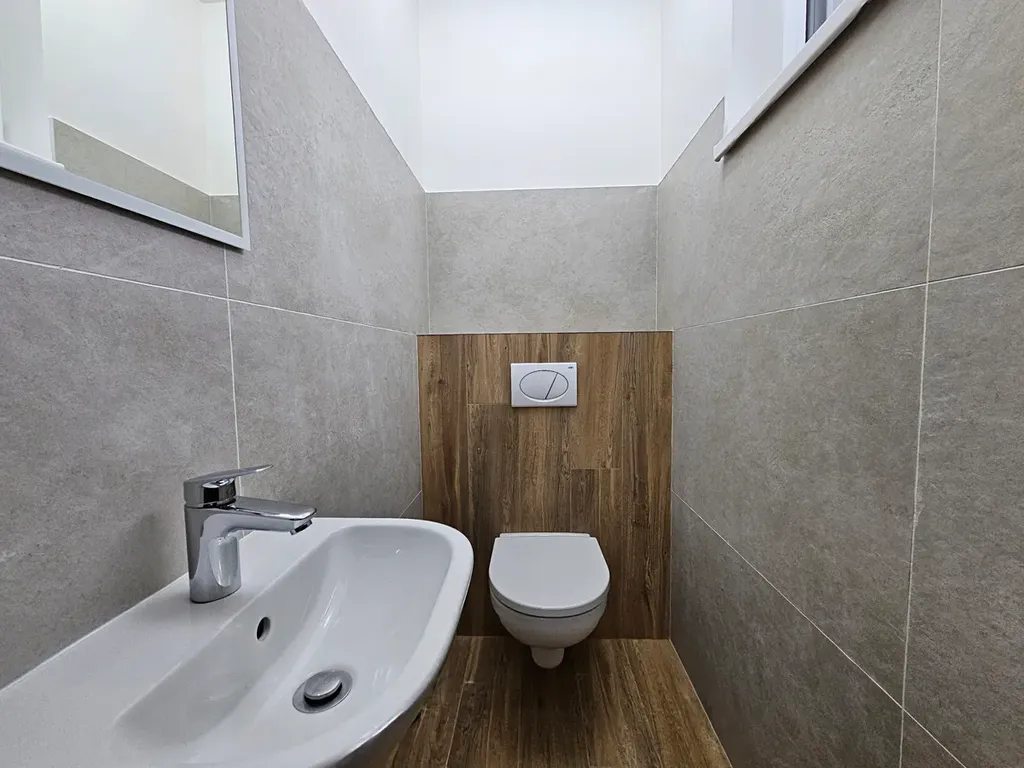 Jednotka disponuje podlahovou plochou 106 m2. V 1 NP se nachází velký obývací pokoj s kuchyňským koutem o výměře 41 m2, vstupní hala, technická místnost, toaleta s umyvadlem a šatna pod schodištěm. Kuchyně s vestavěnými spotřebiči zn. Candy je součástí pronájmu.