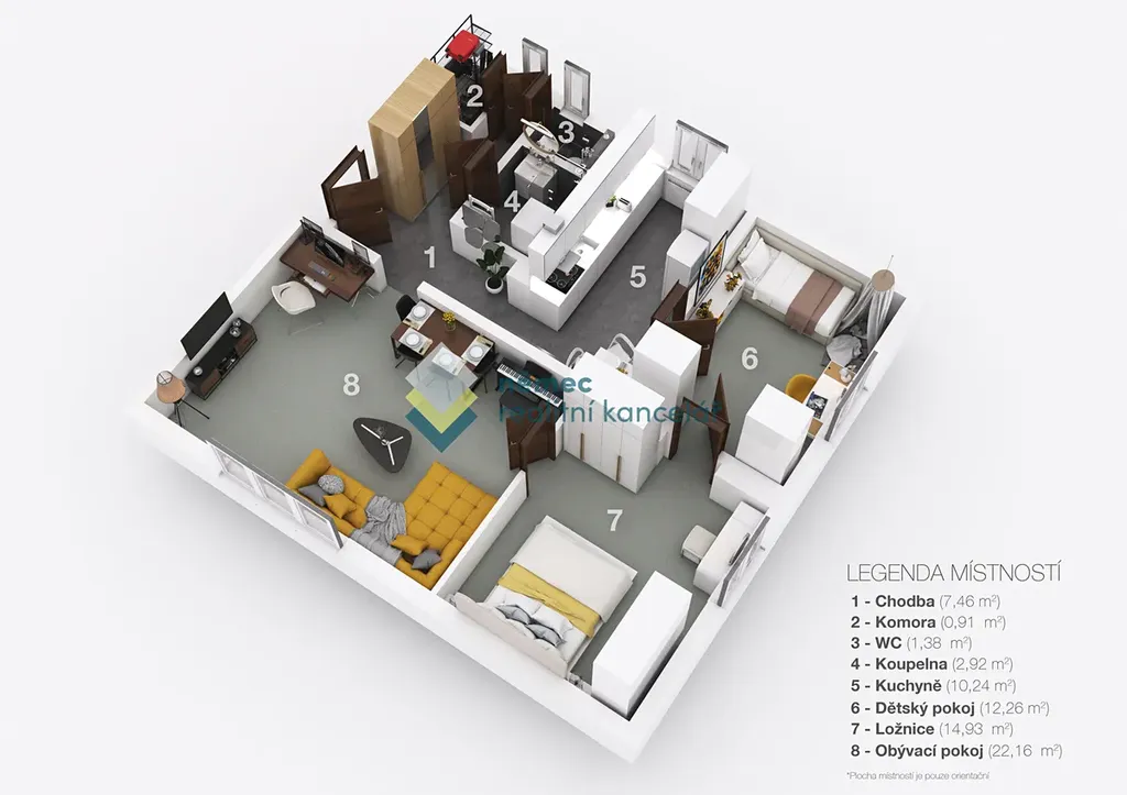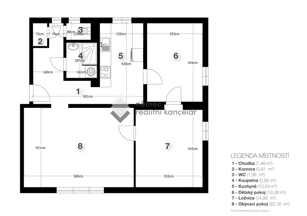 Dispozice tohoto 3+1: Po vstupu do bytu se octnete v prostorné centrální chodbě (7,46 m²), z níž je možné vstoupit doprava do obývacího pokoje (22,16 m²) orientovaného na jih. Na ten navazuje velká ložnice (14,93 m²) orientovaná, stejně jako dětský pokoj (12,26 m²) na východ. Dětský pokoj je přístupný i z druhé části bytu z kuchyně (10,24 m²), která má okno na severní stranu před dům. Je zařízena linkou na míru vč. vestavných spotřebičů na míru. Nabízí jídelní kout, ačkoliv je obývací pokoj dostatečně prostorný pro jídelní stůl. Stejným směrem je i okno z předsíně a toalety (1,38 m²). Odvětrávaná je i spíž (0,91 m²). Praktická je pak koupelna, která nabízí kromě velkého walk-in sprchového koutu prostor pro pračku se sušičkou.