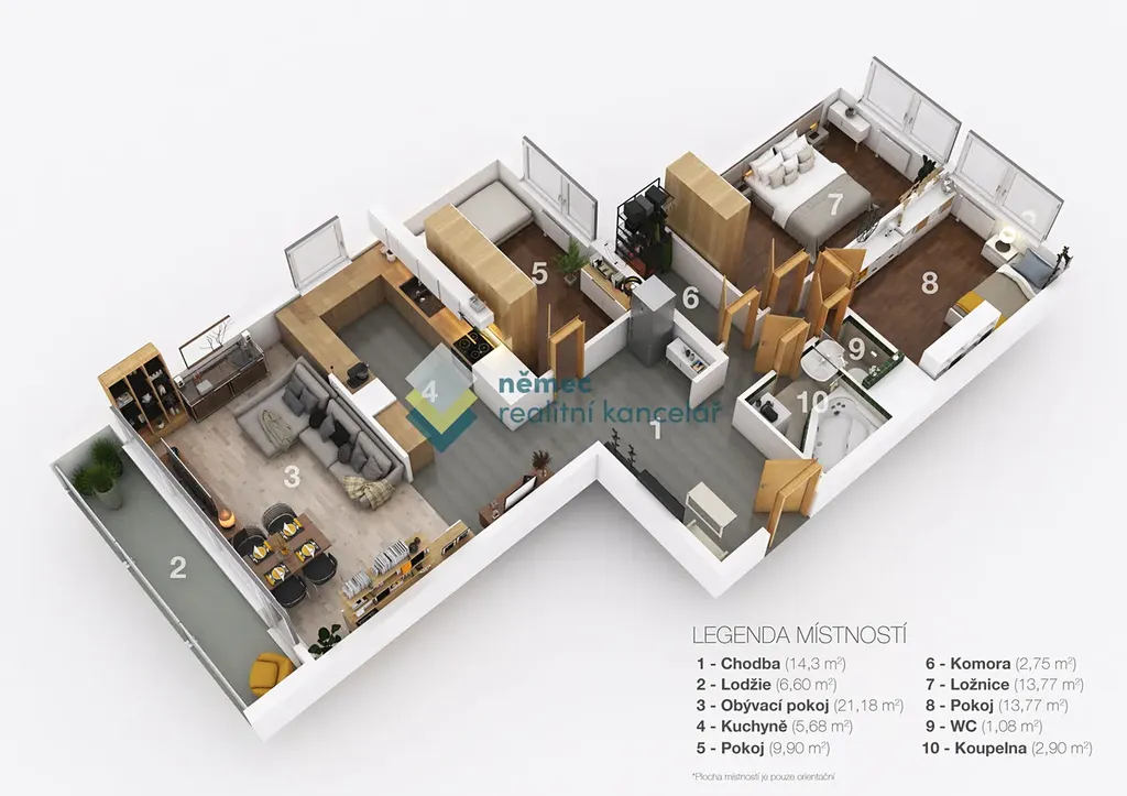 Na východ jsou okna velkorysého obývacího pokoje (21,18 m²) propojeného s kuchyní (5,68 m²) s lodžií přes celou šíři bytu (6,60 m²). Kuchyň má vlastní okno a je velmi šikovně zapojena do interiéru, přesto je velice prostorná a částečně jako prostor pro vaření oddělená. Z centrální chodby (14,03 m²) je možné vstoupit do všech obytných místností, do koupelny (2,90 m²) i na samostatnou toaletu (1,08 m²). Dispozice tohoto bytu 4+1 je opravdu praktická. Všechny tři pokoje (13,77, 10,57 a 9,90 m²) mají okna na západ. Jeden je za kuchyní, dva jsou oddělené v druhé části jednotky.