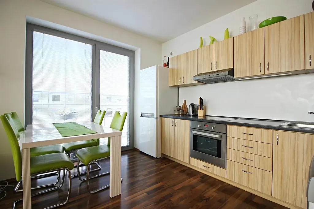 Kuchyňská linka je vybavená sklokeramickou deskou s digestoří, troubou a lednicí.