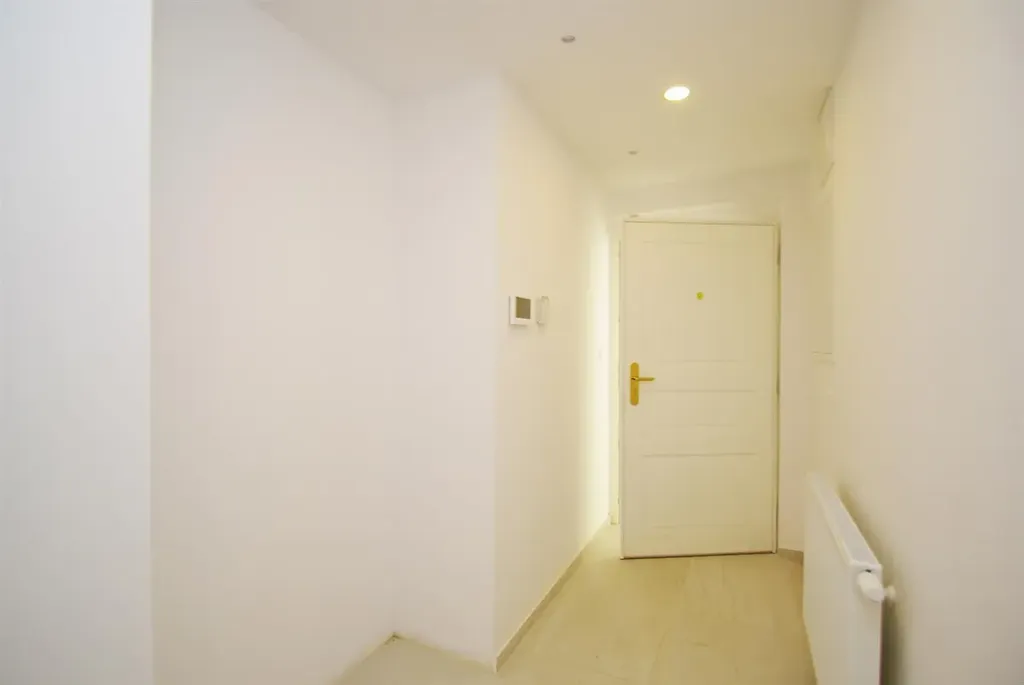Interiér bytu je nezařízený. Dispozice ve spodním patře nabízí vstupní halu, obývací pokoj, ložnici, samostatnou kuchyni, dvě koupelny. Kuchyně je vybavena linkou s vestavěnými spotřebiči: trouba, varná deska, myčka, lednice s mrazákem. První koupelna je vybavena vanou, toaletou a bidetem, druhá je vybavena sprchovým koutem, toaletou a bidetem. Z obývacího pokoje vedou schody nahoru do horní úrovně bytu, kde se nachází podkrovní pokoj a toaleta. Byt je vybaven klimatizací.