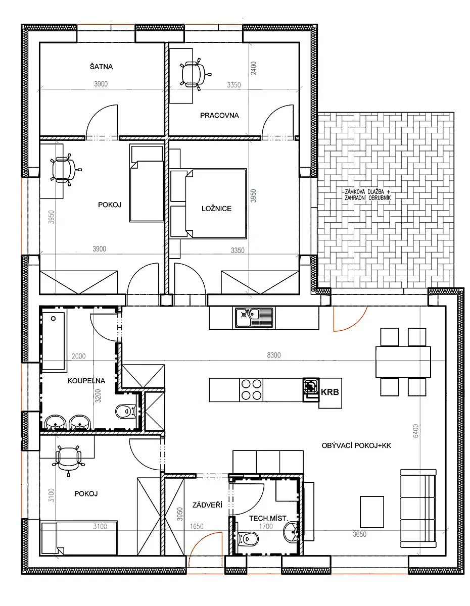 Vybavení v ceně: Neřešíte jen hrubou stavbu. Cena zahrnuje projekt, stavební povolení, finální podlahy, obklady, kompletní sanitu, interiérové dveře i napojení na sítě v rámci pozemku.