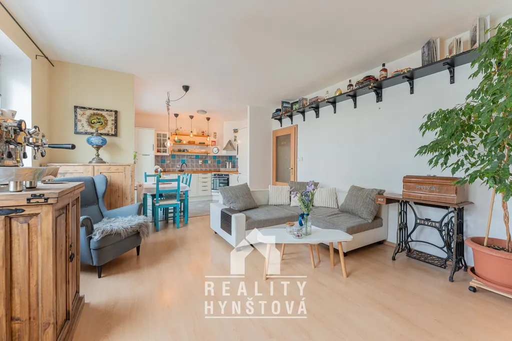 Dominantou bytu je obývací pokoj o ploše přes 20 m², který plynule navazuje na kuchyňskou část a vytváří plnohodnotný prostor pro každodenní život.