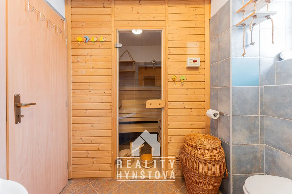 V koupelně určitě oceníte okno pro přirozené větrání a je zde umístěna také sauna.