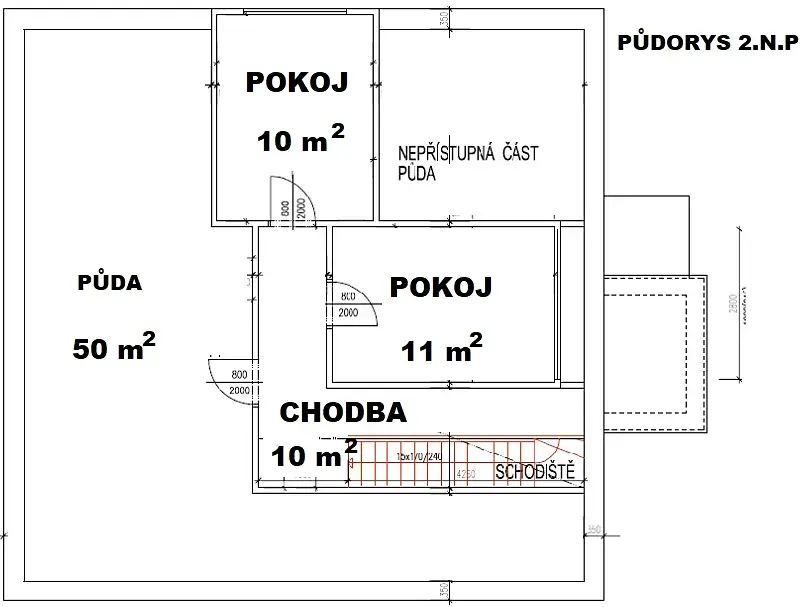 2. nadzemní podlaží: dva letní (sezónní) pokoje bez vytápění, přístupné schodištěm.