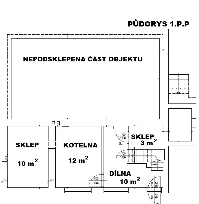 1. podzemní podlaží (suterén): tři technické místnosti včetně kotelny a vstupu na zahradu.