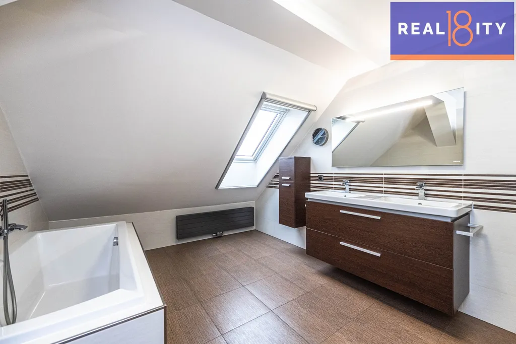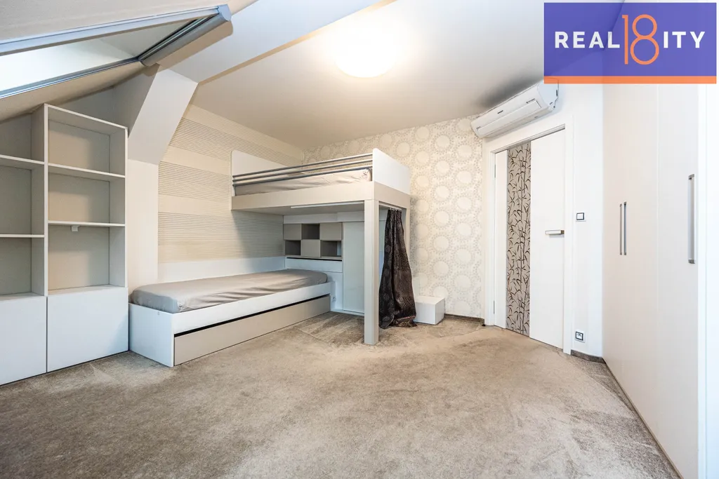 Připraven k okamžitému nastěhování – nabízen včetně veškerého nadstandardního vybavení a nábytku na míru. Kuchyně značky Hanák se spotřebiči Bosch, kožená sedačka a další značkové zařizovací předměty interiéru, dětský pokoj z masivu udělaný na míru, prostorná šatna s botníkem a policemi, vestavěné skříně.