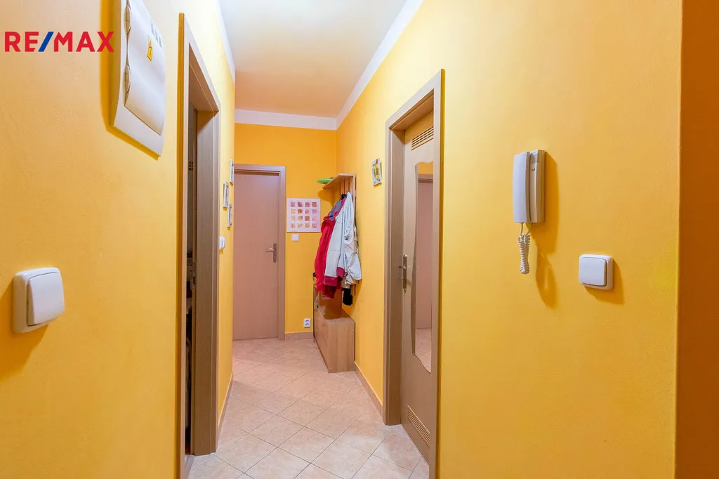 V jednom pokoji se nachází vestavěný nábytek, postel 140x200 cm bez matrací, psací stoly se zásuvkovým kontejnerem. Druhý pokoj je nevybavený. Praktickým benefitem je také prostorná komora přímo v bytě, vybavená policovým systémem. Na chodbě je umístěna věšáková stěna s botníkem.
