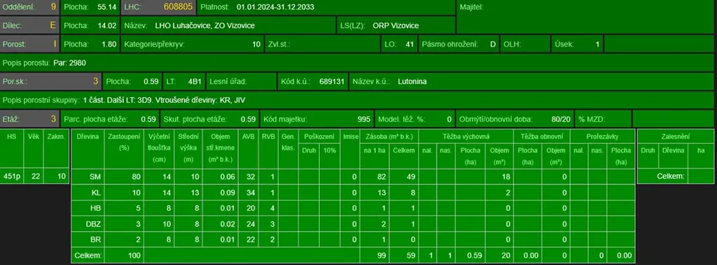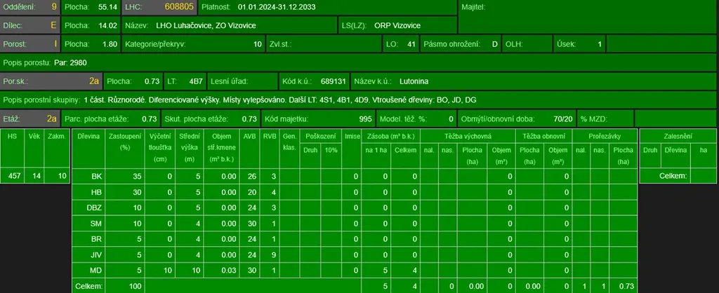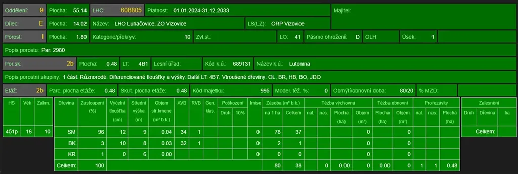 - p.č. 2980 vedená jako lesní pozemek o celkové výměře 18 019 m2 (stáří lesa 24 let - zastoupení dřevin smrk, javor, habr, dub, bříza, stáří lesa 18 let - zastoupení dřevin smrk, buk, keře, stáří lesa 16 let - zastoupení dřevin buk, habr, dub, smrk, bříza, vrba, modřín).