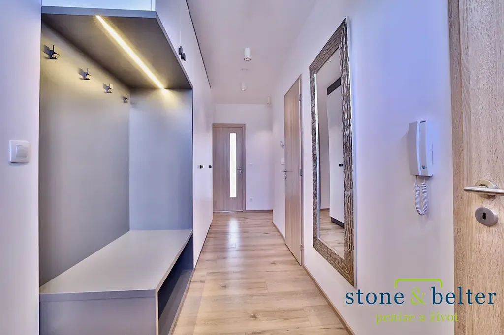 Byt se skládá z obývacího pokoje s kuchyňským koutem (33,1 m²), ložnice (15,1 m²), 2 pokojů (12,7 m² a 14,1 m²), 2 koupelen s toaletou (4,3 m² a 3,9 m²), technické místnosti pro pračku a sušičku (1 m²), vstupní chodby (13,6 m²) a chodby s úložným prostorem vedoucí k ložnici (6,8 m²). K bytu dále náleží sklep.