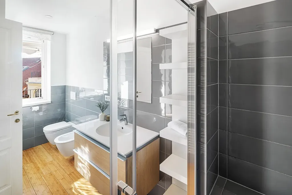 Vstupní podlaží bytu tvoří obytná část s prostorným obývacím pokojem a plně vybavenou kuchyní, dále ložnice, samostatná šatna a komfortní koupelna s vanou, sprchovým koutem, toaletou a bidetem.