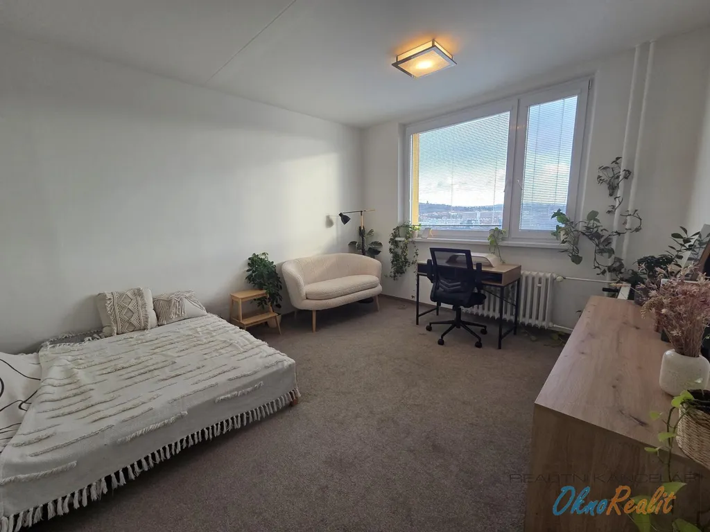 Nabízí se částečně zařízen, kuchyně je vybavena kuchyňskou linkou s vestavěnou lednicí, troubou, el. varnou deskou, jídelním stolem, v pokoji šatní skříň, koberec. Pračka není součástí vybavení.